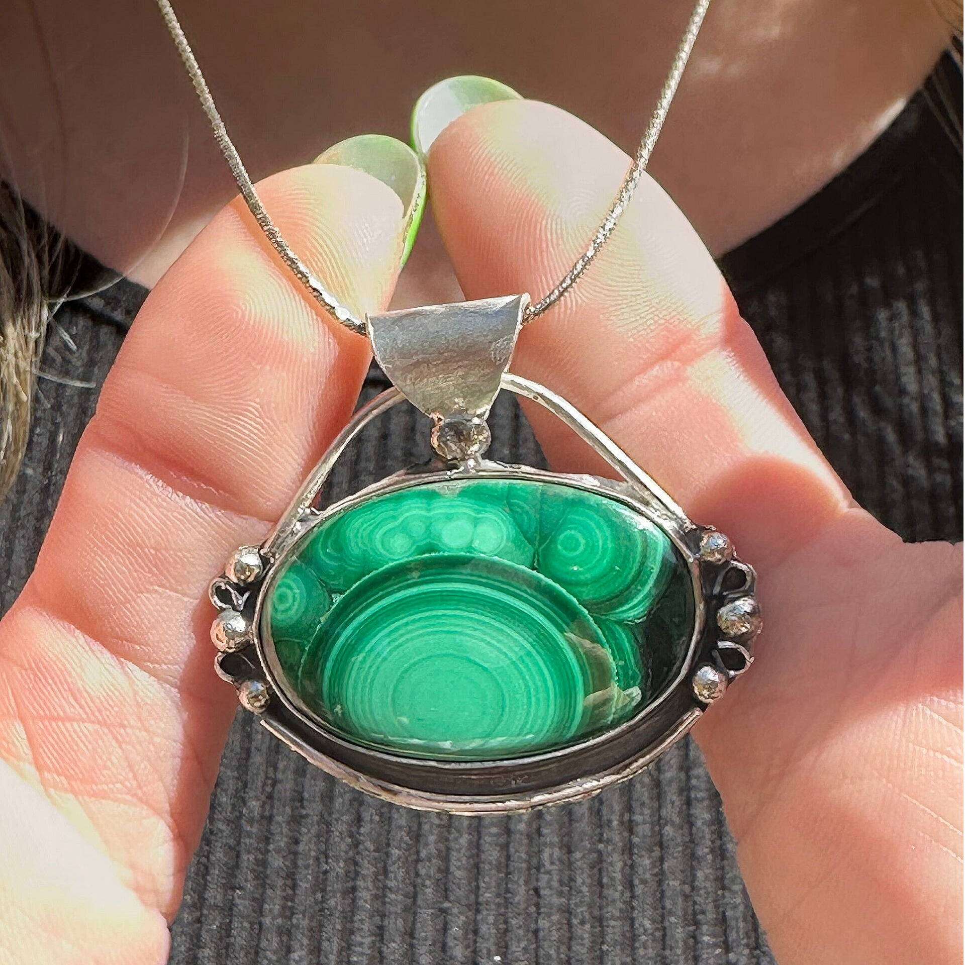 This elegant horizontal pendant features a richly banded Malachite gemstone securely bezeled in .925 ss complementing the organic beauty of Malachite.