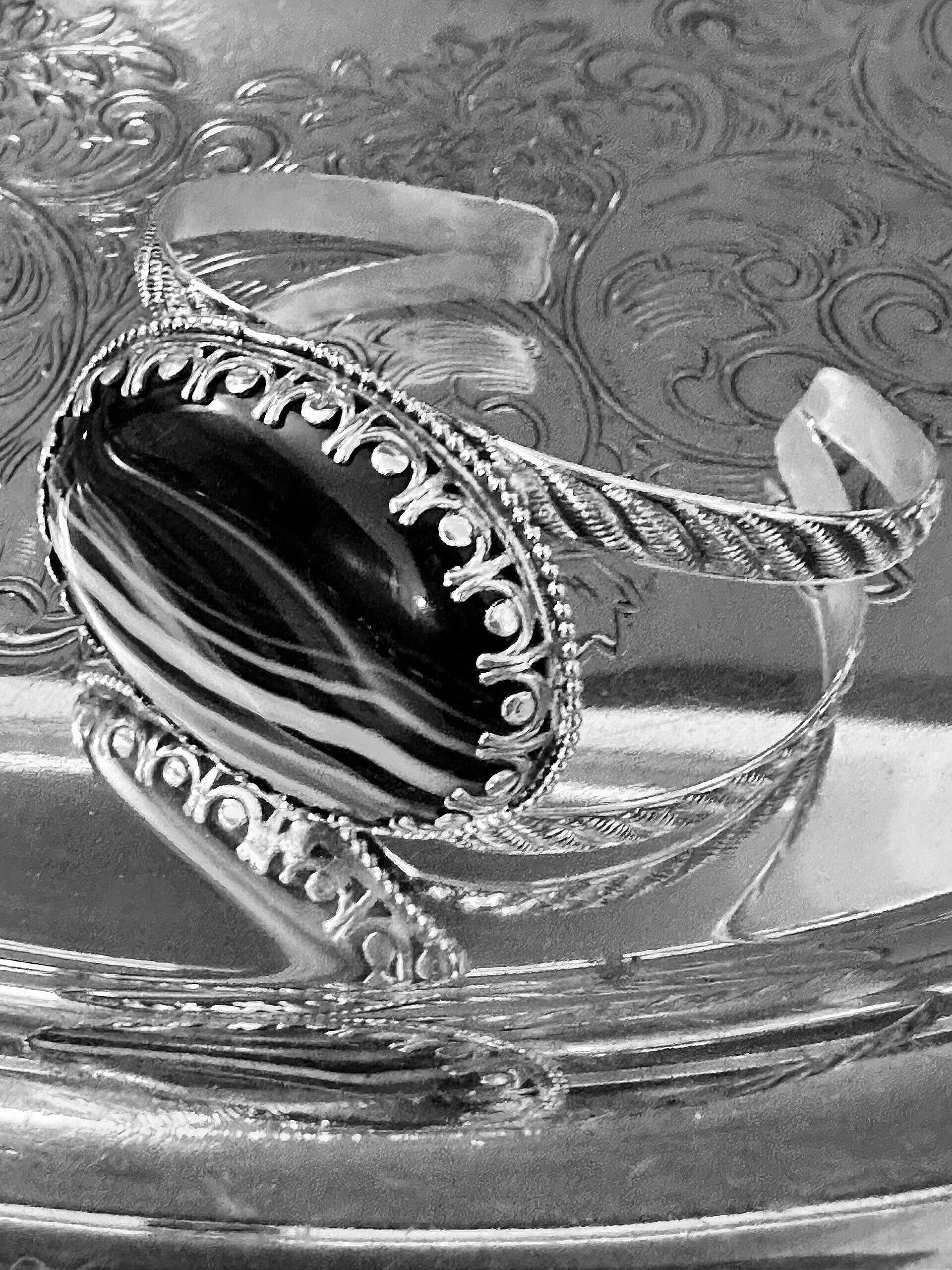 This Black Lace Agate cuff radiates strength and protection. This piece has an adjustable open cuff fit with colors that go with everything.